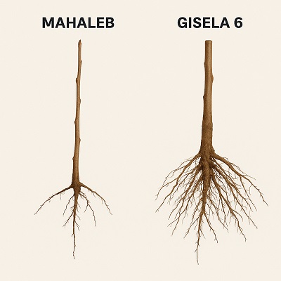Această diferență ține de tipul de portaltoi, nu de calitatea pomului. În pământ, rădăcina de mahaleb are o vigoare naturală ridicată, fiind adaptată pentru soluri mai grele, mai uscate sau mai calcaroase, unde alți portaltoi nu se dezvoltă bine.